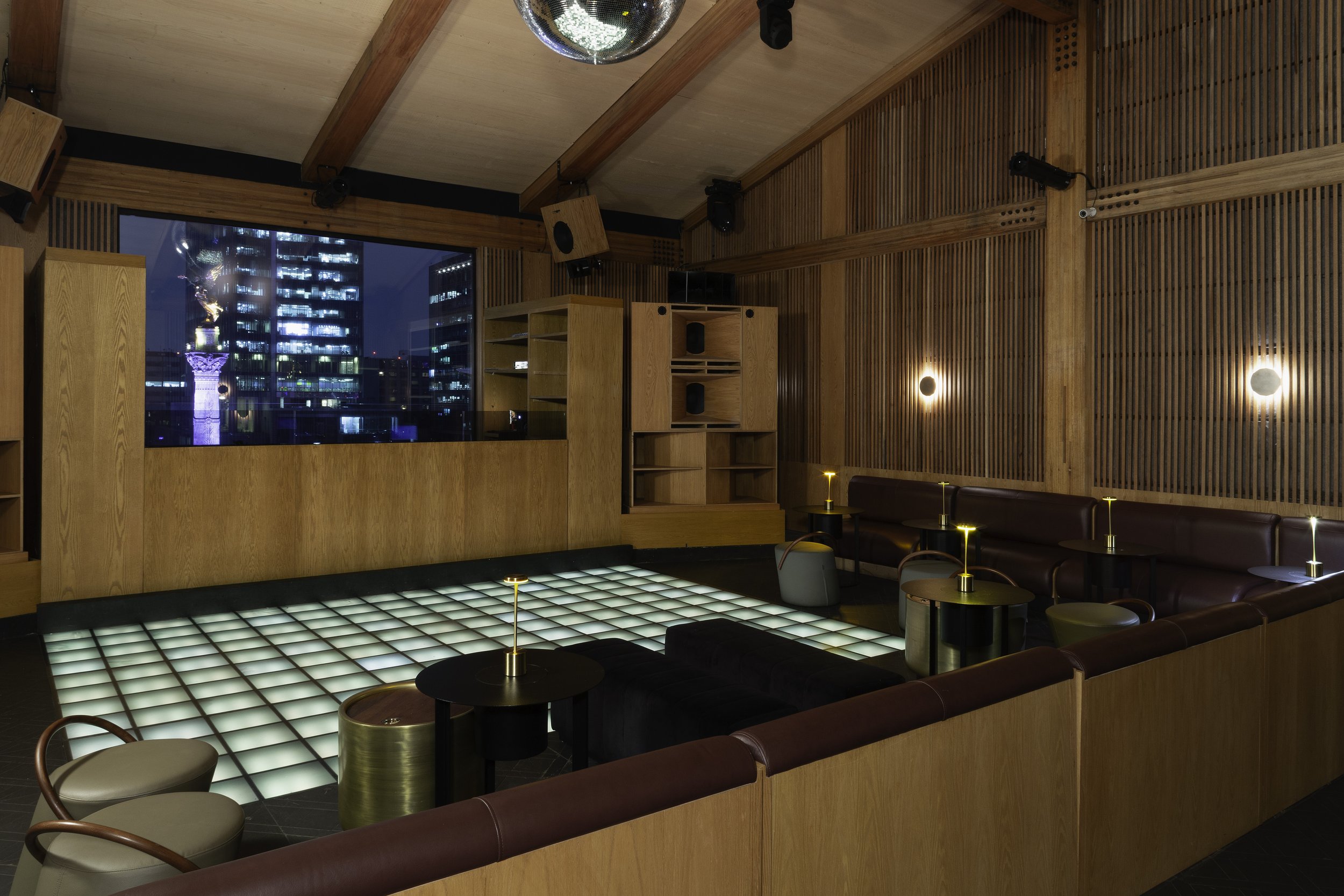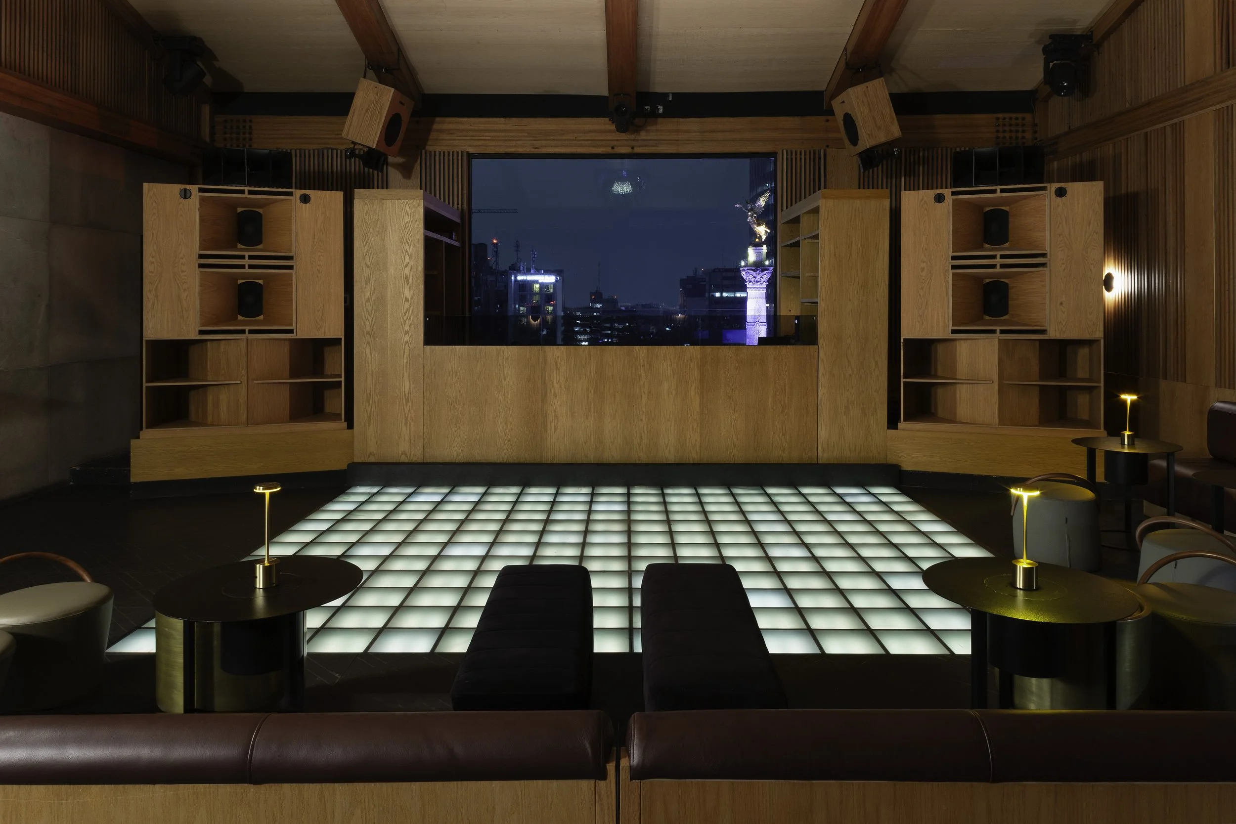 El diseño de interiores tiene como principal protagonitas la madera en piso, muros y techo, lo que además de aportar estética, calidez y ese toque retro al lugar potencializa la calidad del sonido que era una clave para el lugar. El lugar tiene un caracter imponente que enmarca uno de los símbolos más emblemáticos de la Ciudad de México, el Ángel de la Independencia.
